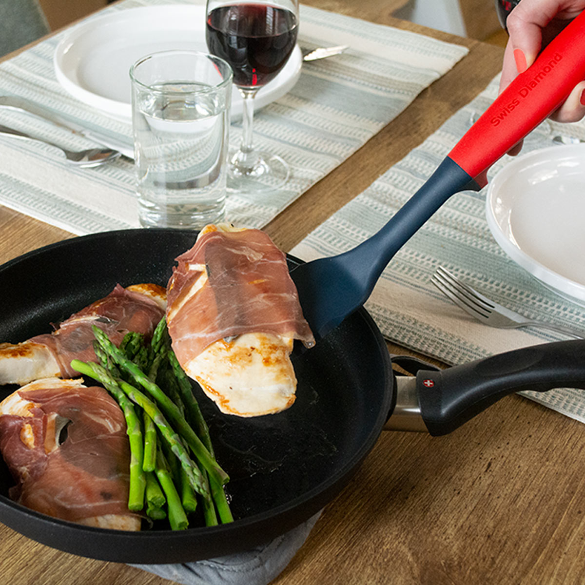 Embark on a culinary journey with our accessories line, enhancing your kitchen experience. Our turner spatula, designed for seamless food handling, and the precision serrated bread knife ensure effortless slicing. The sturdy glass lid, with a stainless steel lip, prevents boil-overs, allowing easy monitoring. Elevate your skills with Swiss Diamond Accessories, where each tool brings superior performance and convenience. Whether flipping, slicing, or simmering, our collection has the perfect tool for every culinary endeavor. Transform your cooking routine with Swiss Diamond.